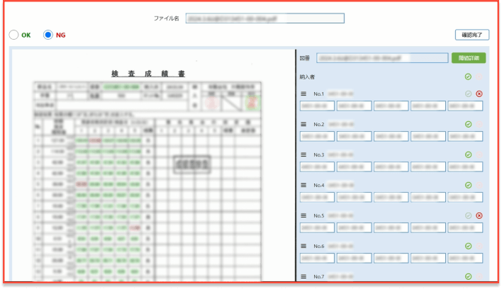 部品メーカーから提供される手書きの検査表の合否を自動で判定します。業務の効率化を図り、正確な品質管理をサポートします。